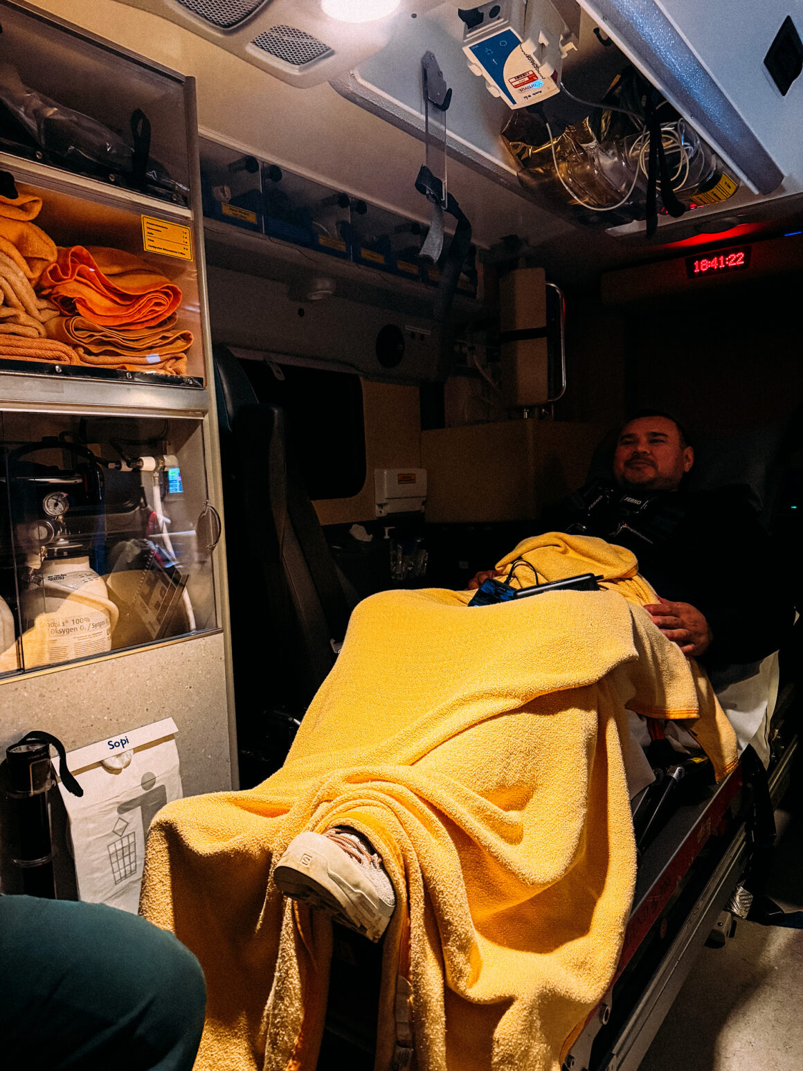 Lördagen började med långfrukost och sedan skulle vi göra i ordning sommarstugan inför vintern. Så vi åkte dit och en timma senare låg min kille på golvet och kunde inte komma upp därifrån på fem-sex timmar. Krampande ryggmuskler golvade honom bosktavligen. Först ringde vi en nätdoktor och hämtade ut recept på muskelavslappnande. Men 3 paraflex senare, tillsammans 2 alvedon och 1 Naproxen, så ringde vi våra allra bästa fysioterapeuter hemma i Åre och de sa båda samma sak. Använd skattepengarna, han behöver komma upp från golvet och för det krävs något starkare. Så vi fick besök av en stor ambulans och två sköterskor som tillbringade nästan två timmar hos oss. Först då hade Danny tillräckligt med tunga läkemedel i kroppen för att kunna stappla sig iväg, och faktiskt åka med till akuten.