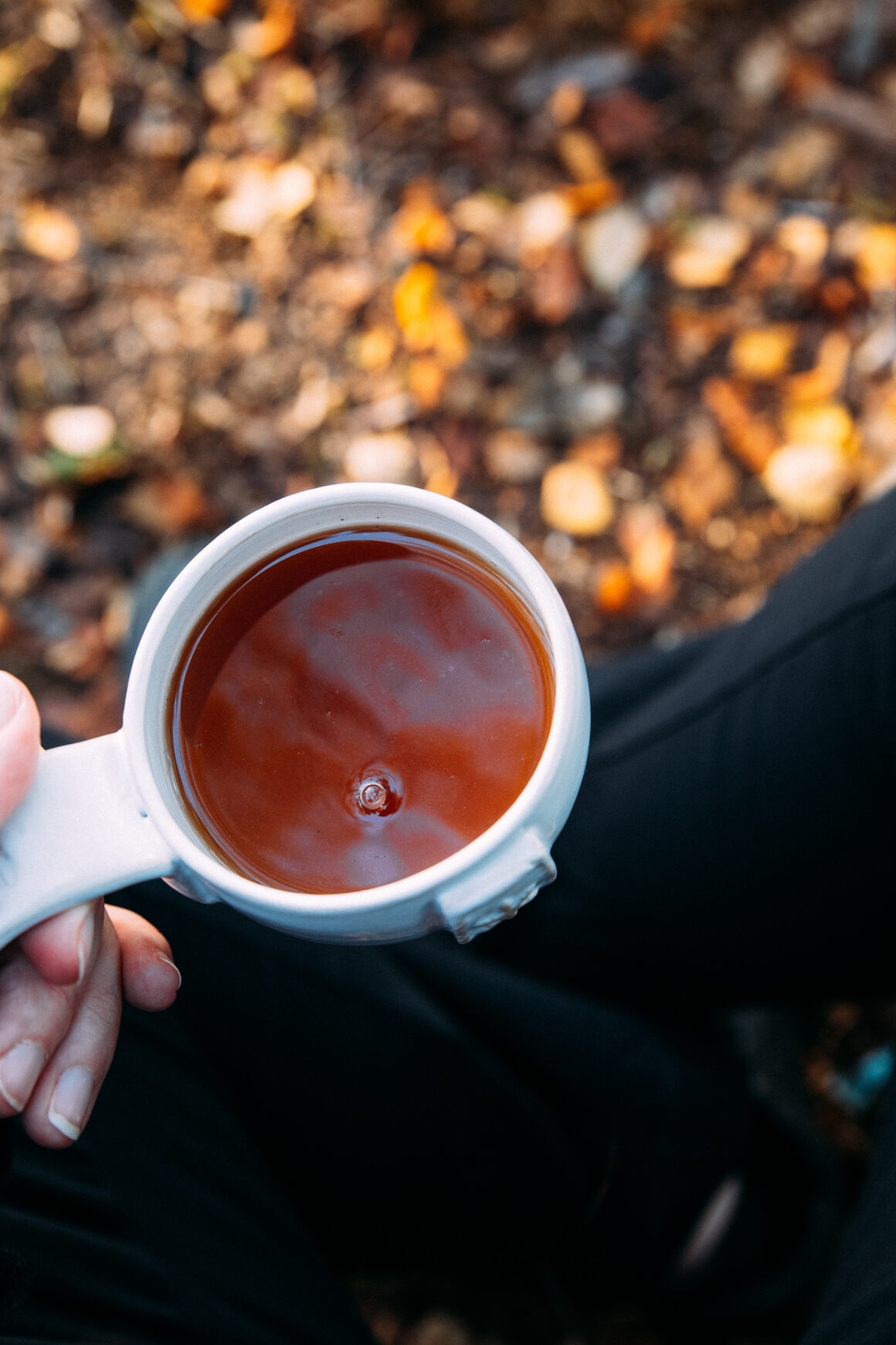 Byxa och fleece från Astrid Wild pga utomordentligt bra för livet mellan kokkaffe, elda vedspis och bara ha det nice. Svarta Nike sneakers som inte är ett dugg bra för något slags utomhusliv där man ska gå stig, men vi skulle ju inte det. Underställ från min brors märke Aune. Merinoull. Det understället trivs bra både i vildmark och på vinbarer. Dress for the occasion, så att säga. Vi hade ju med champagne. Men, vi började med äppelglögg som vi värmde över elden.