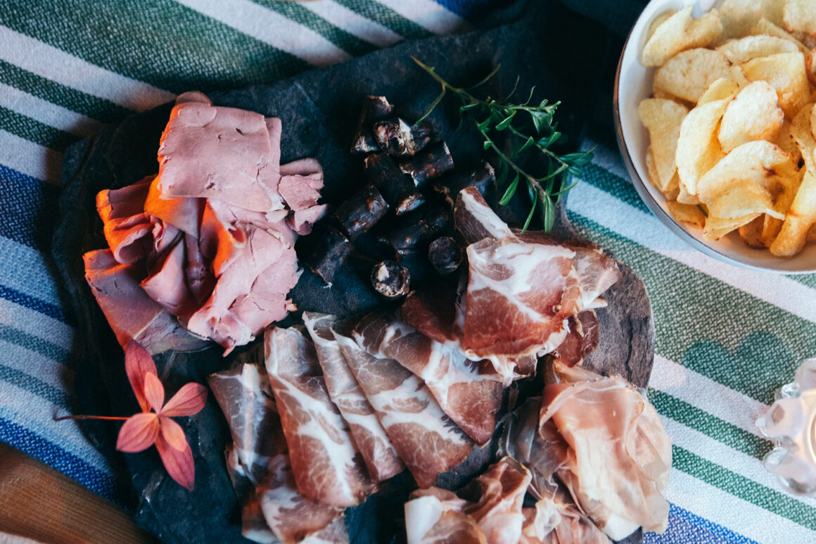Skål för detta, sade vi och dukade upp en hundraprocentig girl dinner på duk inne i kåtan. Vildfångad fjällröding med hjortronsylt på parmesanchips. Några olika ostar från både Frankrike och Jämtland. Chark från Fäviken.