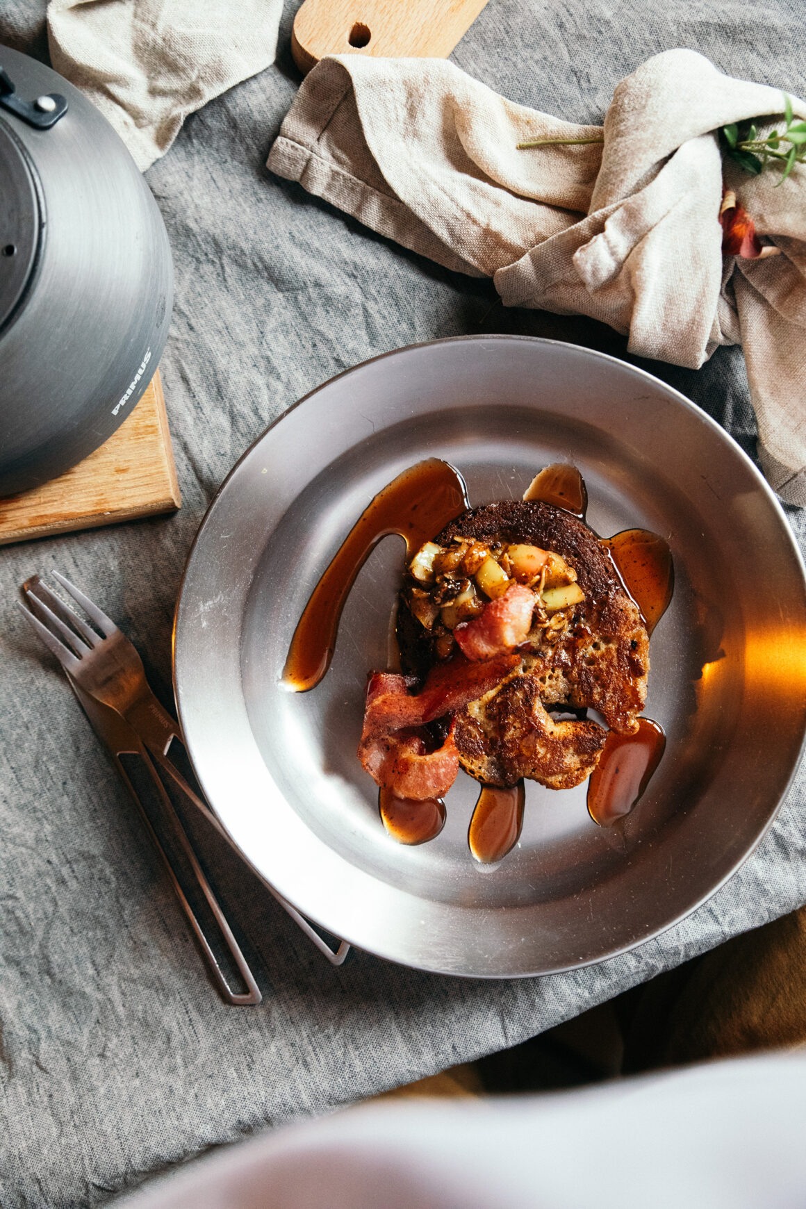 Amerikanska pannkakor med knaprigt bacon, smörstekt äpple och ringlad äppelsirap. Ljuvligt.