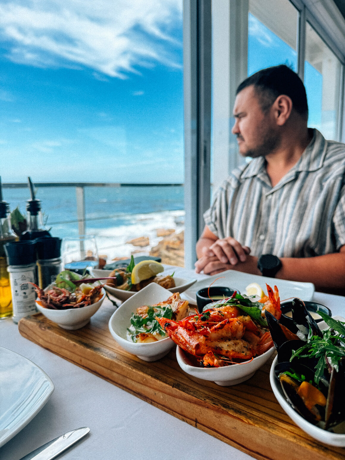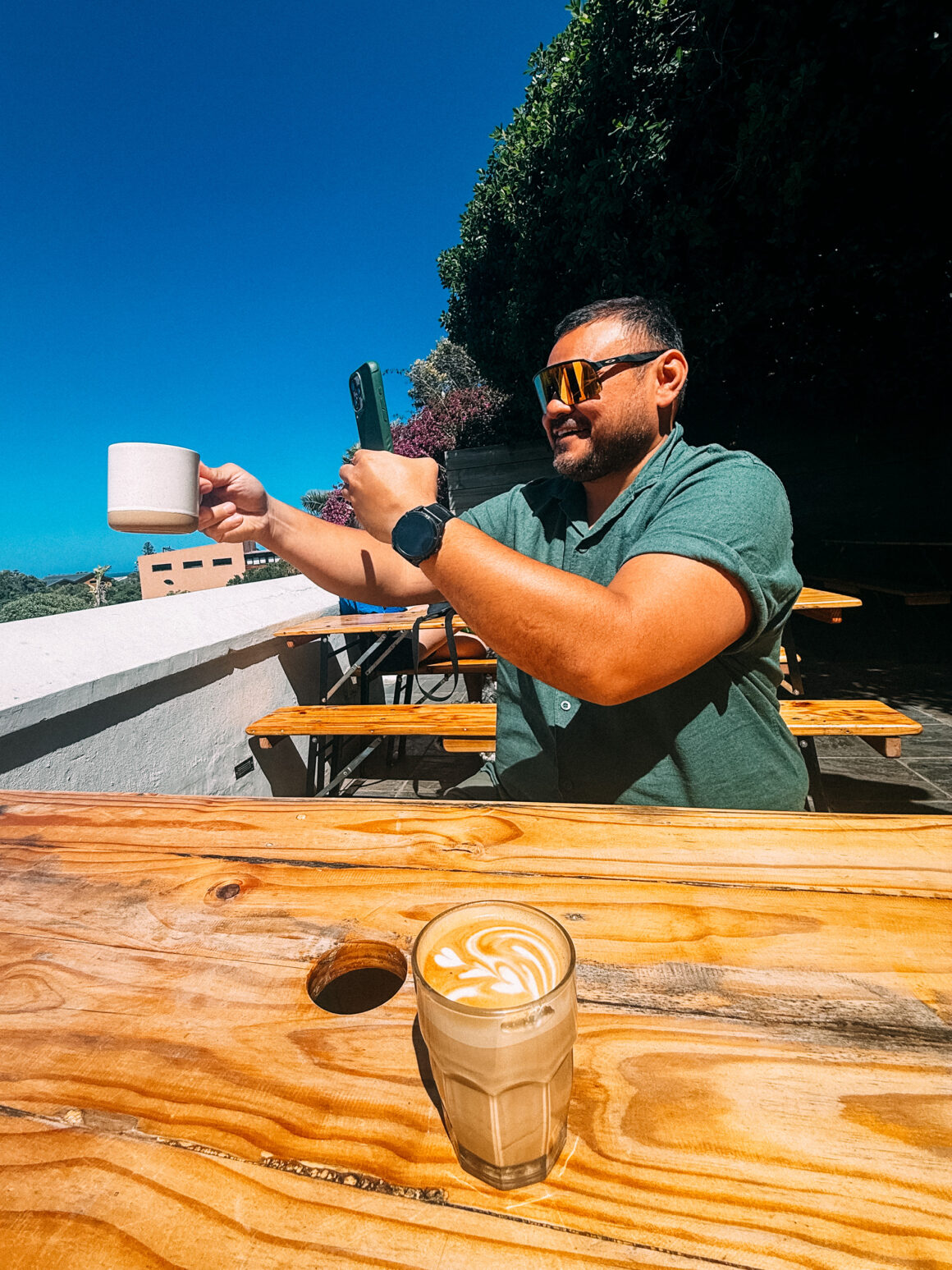 Nedanför hotellet och på andra sidan gatan, precis där stranden börjar, ligger Sentinel Coffee. Ett strandcafé där jag sett att människor samlats på morgnarna efter sin morning beach walk. Det har varit fullsatt. Imorse satt vi där, jag och Danny, och huttrade lite i den tidiga snålblåsten. Med en flat white i handen och delfiner som hoppade inte långt från strandkanten. En mäktig upplevelse. En av många!