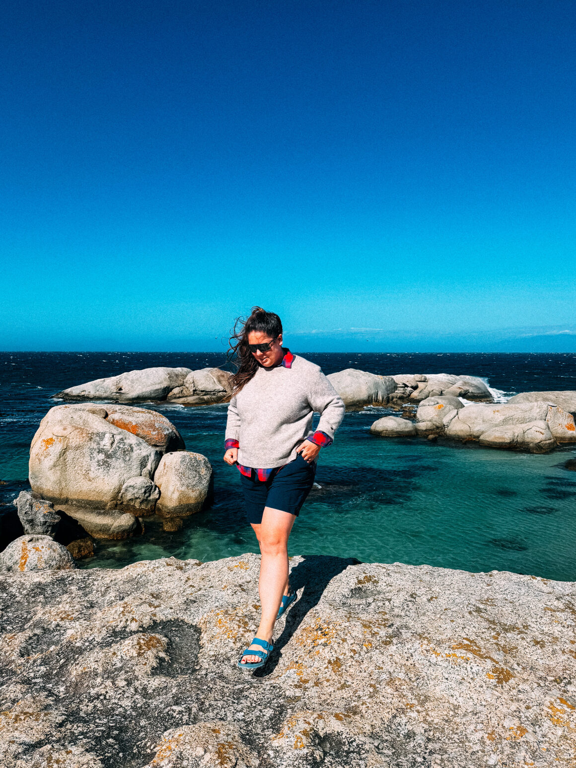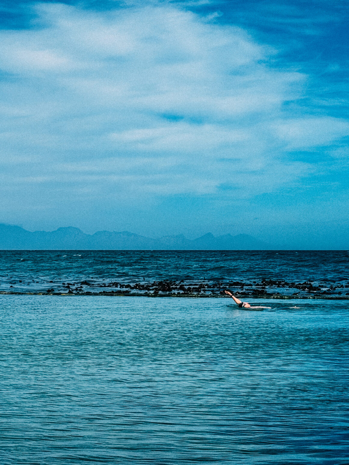 Vi badade i tidal pools Kalk Bay, där poolerna ligger precis vid strandpromenaden men också intill tågrälsen. Här samlas människor i alla åldrar: några simmar längder, andra doppar sig snabbt på väg hem från jobbet. Vattnet är kallt, och påminner lite om sommarbad där hemma. Ibland slår vågorna över kanten, ibland passerar ett tåg. Det är stort hav och trafik som krockar på ett rätt så fint sätt.
