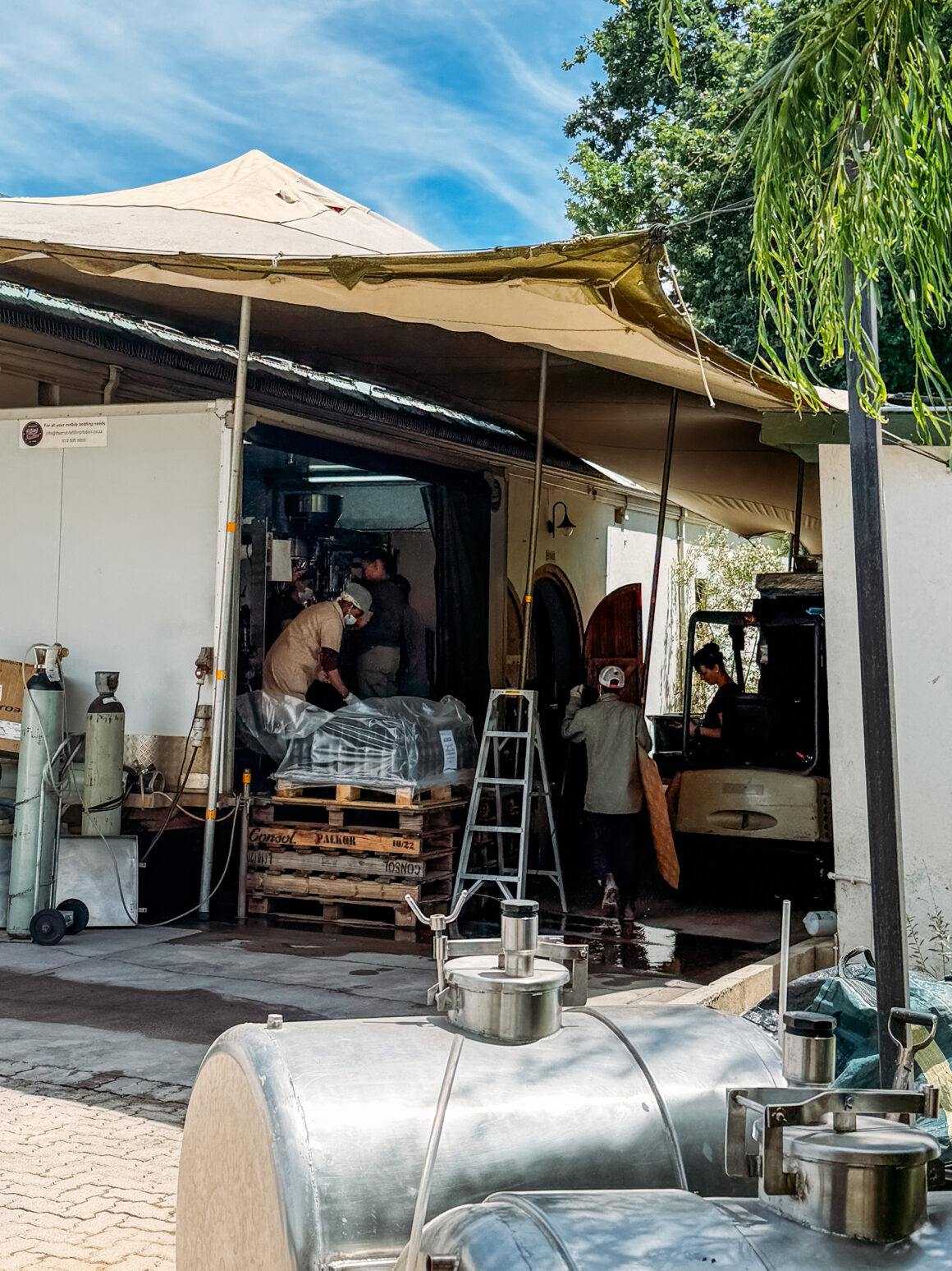 Hos David & Nadia är det hektiska tider och mycket görs för hand. Flaskor buteljeras när vi är där. De ligger efter i tidsschemat och alla jobbar metodiskt och fokuserat. På Porseleinberg som jag nämnt tidigare gör man alla etiketter för hand. Det kommer jag att registrera varje gång jag vidrör en flaska framöver. Vin är verkligen hantverk!
