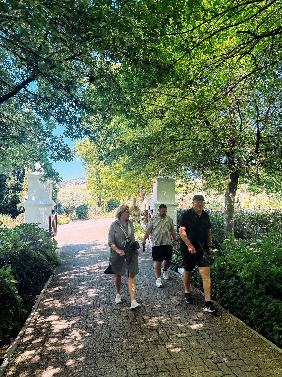 En eftermiddag, när vi precis besökt en av de större vingårdarna som har asfalterad väg hela vägen fram till entrén, åkte vi en dirt road upp mot en höjd och möttes av leksaker i en trädgård där man lagt fokus på annat än bedårande växtlighet (jag syftar på De Morgenzon). Här gör man istället riktigt bra vin. Lukas tog emot hemma hos sig själv, och vi fick sitta på hans privata patio och dela bord med 3 andra vinnördar från Tyskland och Holland.