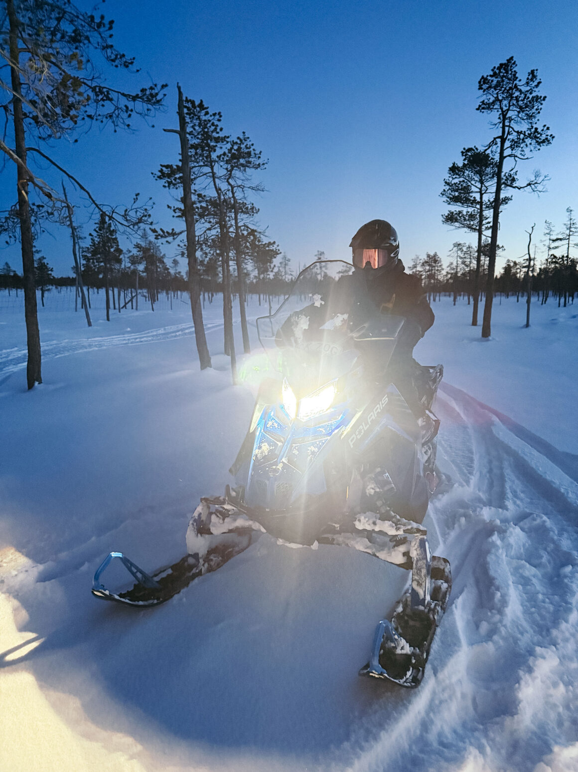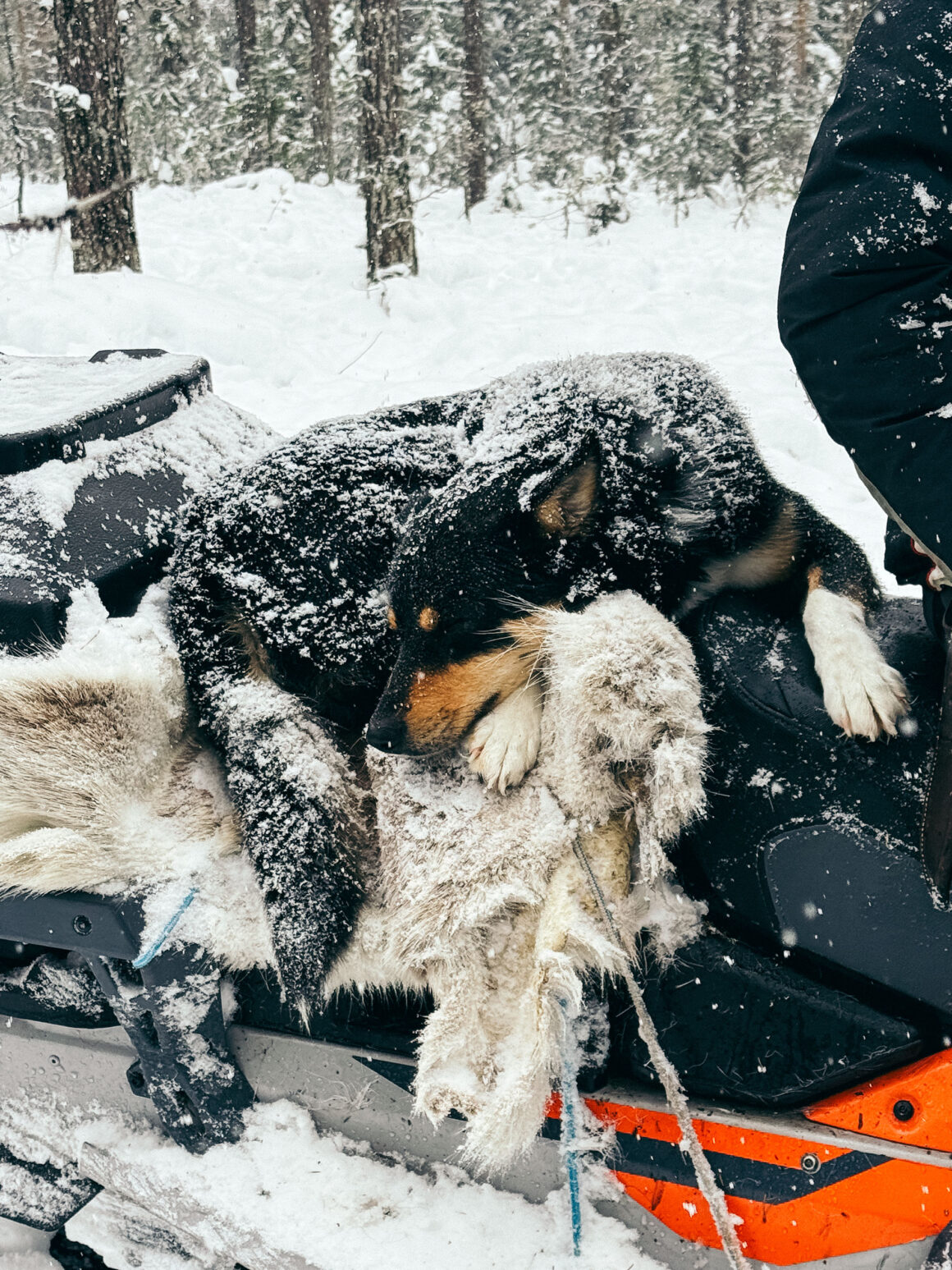 Marcus läste vant av terrängen och körde som en vessla på sin ledskoter mellan stock och sten, dessutom med hund på snöskotern. Jag körde för glatta livet och använde muskler jag sällan använder annars. Det var tekniskt, men kul. Framförallt ville jag inte försvåra eller försena arbetet för Marcus. I friåkningen tillhör det att man kör fast och håller på och grejar. Men nu var vi ute på uppdrag, det fanns ingen tid för krångel. Jag tror och hoppas att vi skötte oss okej.