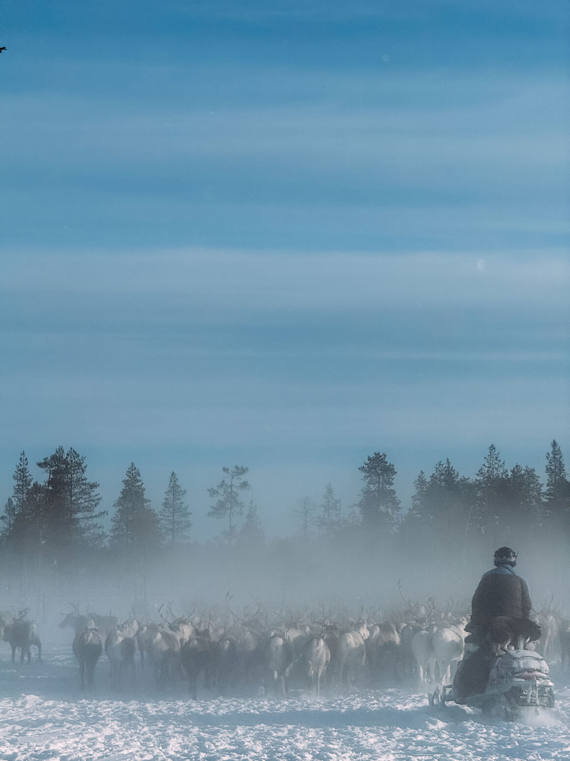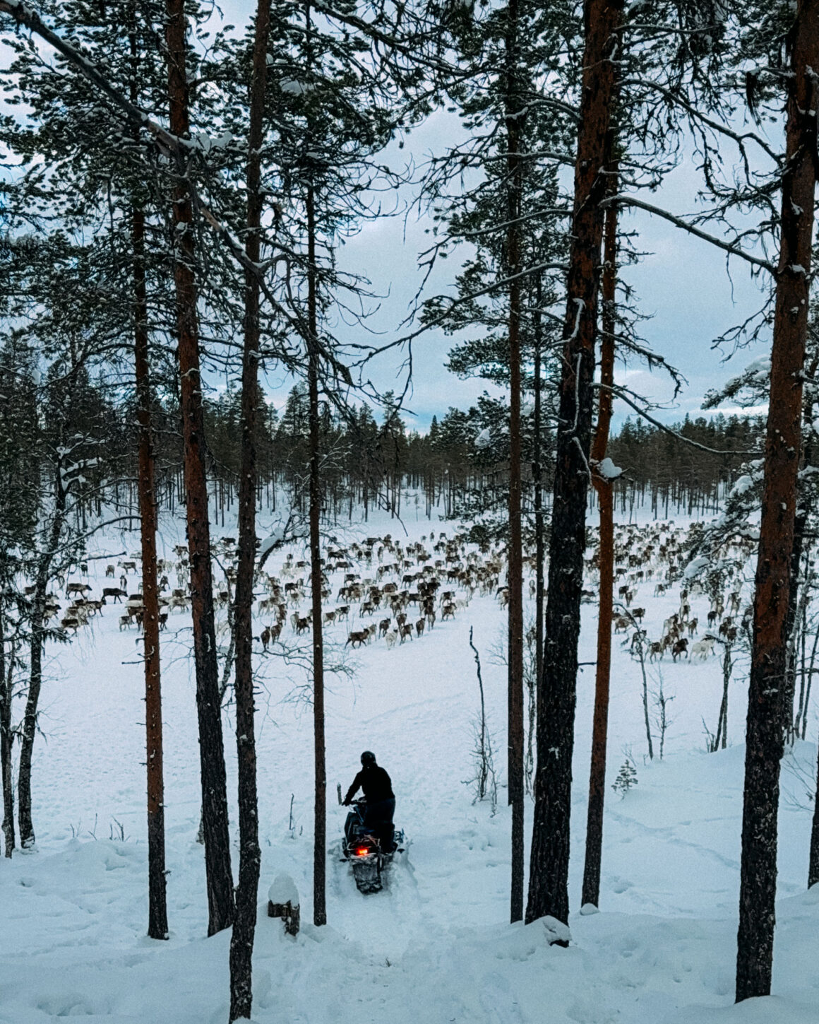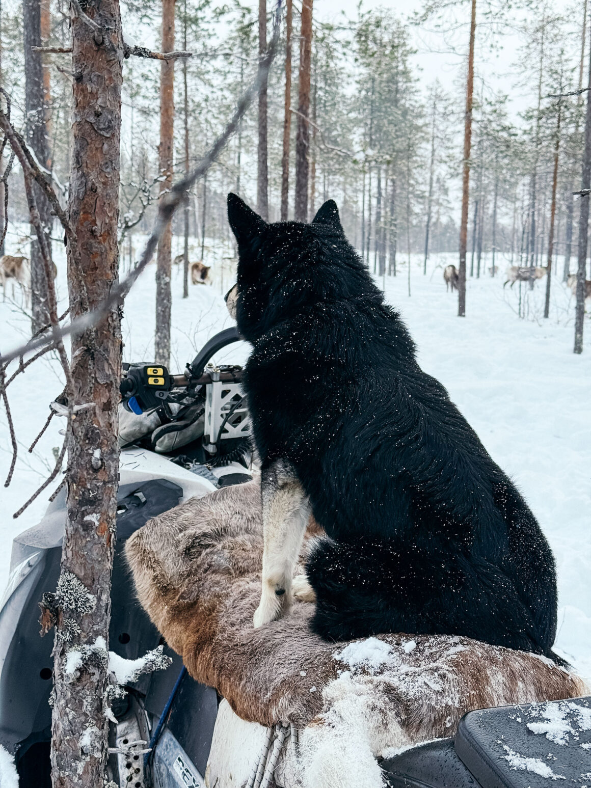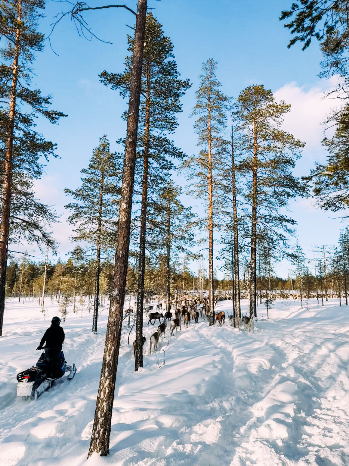 Att driva en renhjord framför sig är en mäktig syn. Snöröken bakom. Solljuset framför. Alla dessa fantastiska djur som förflyttas åt samma håll. Att se renskötarna och skoterförarna vant driva renarna framåt, och när några renar vill vika av och drar fler i flocken med sig så är förarna vant framme och samlar in renarna igen tack vare både skotrar och hundar som vallar. “Jobba som ett gummiband” instruerade Marcus, och vi gjorde vårt bästa.