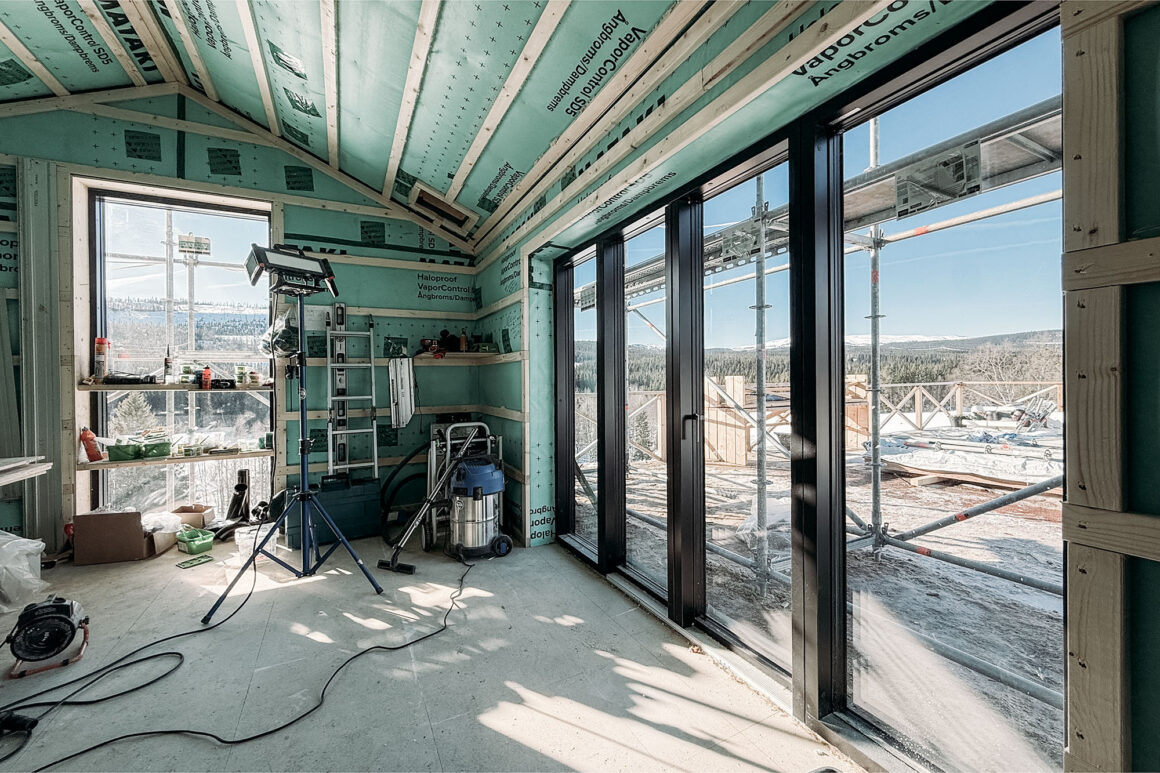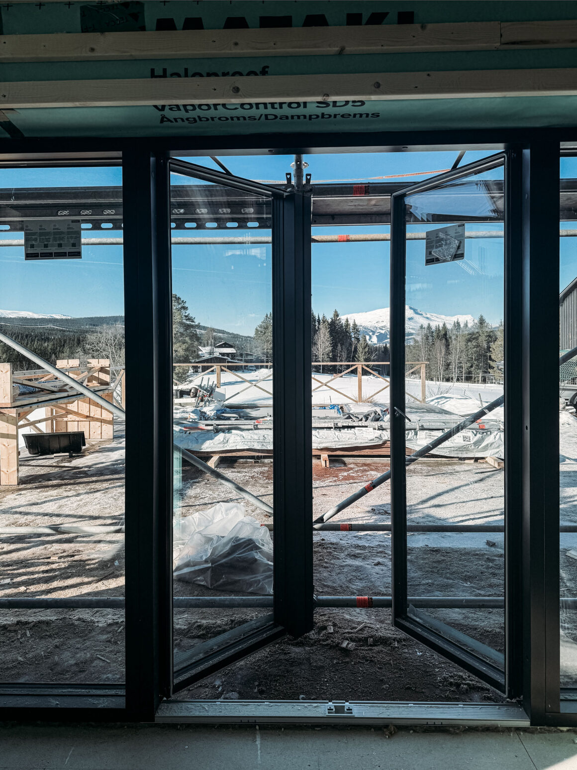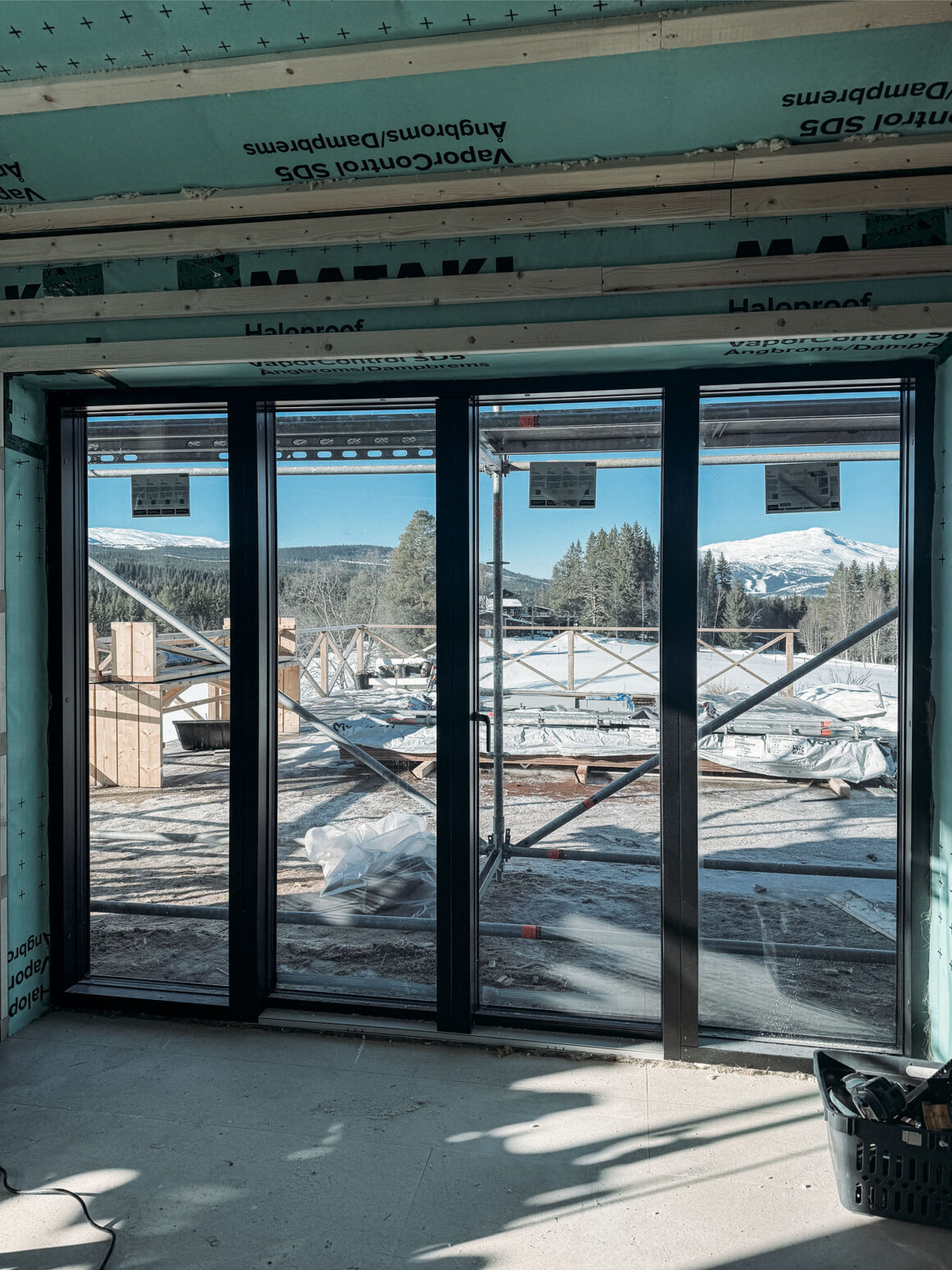 Efter att nästan ha slumrat i solstolen i några timmar fick jag ny energi i benen och gick in till fjällstudion och kontrollmätte några saker inför kommande beslut. Jag provöppnade Velfacdörrarna också, vilket nästan gick. Byggställningen står som en broms där ute ännu ett tag, men jag längtar efter att hela utsidan är klart så att jag får se allting i sin helhet.