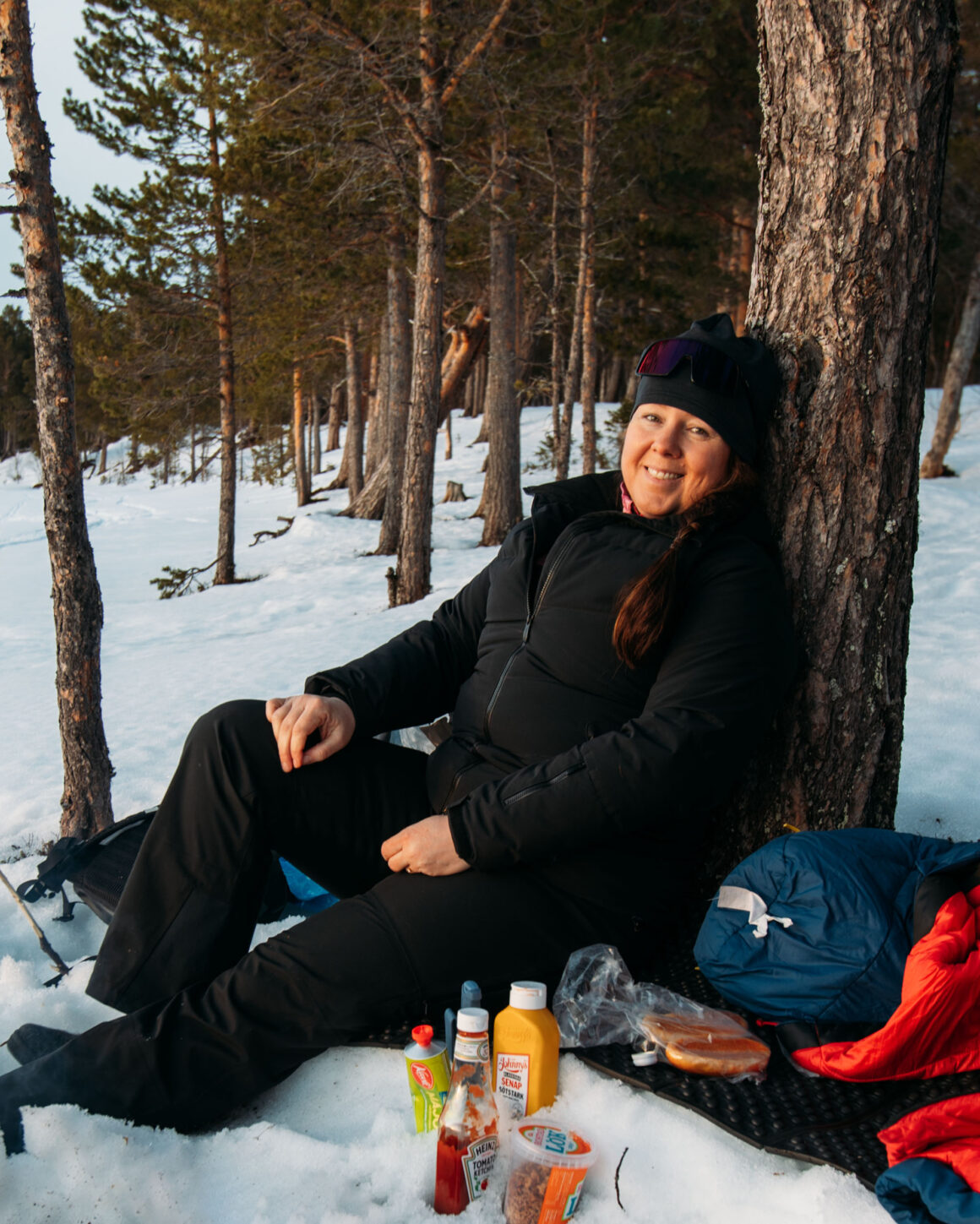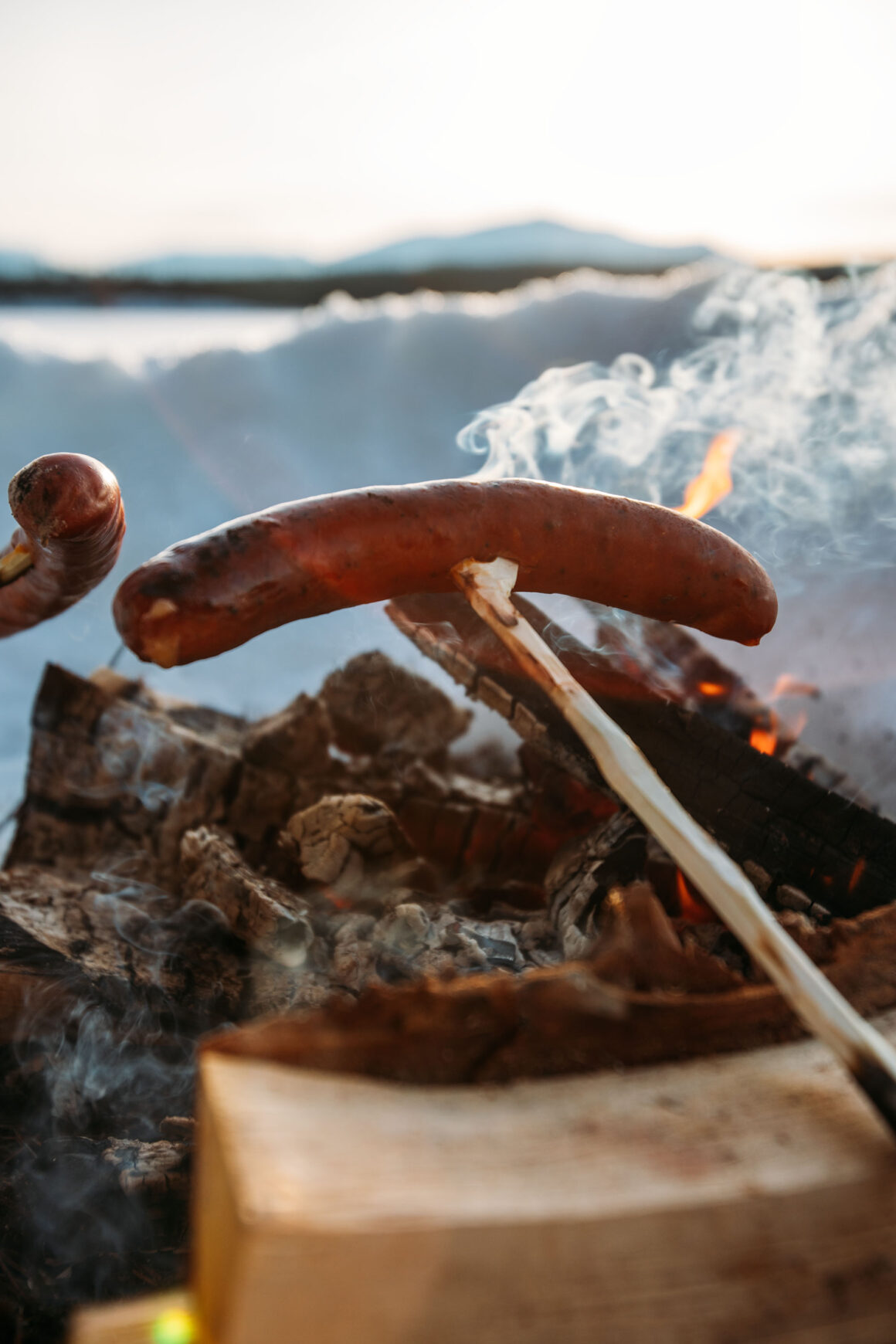 På eftermiddagen packade jag korv, kniv och ved och åkte för att träffa en annan vän. I Stockholm ses man på uteservering. Här i Åre ses man över en eld.