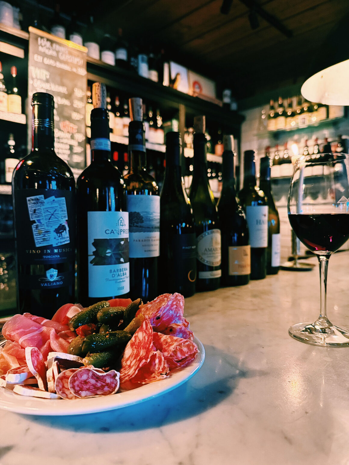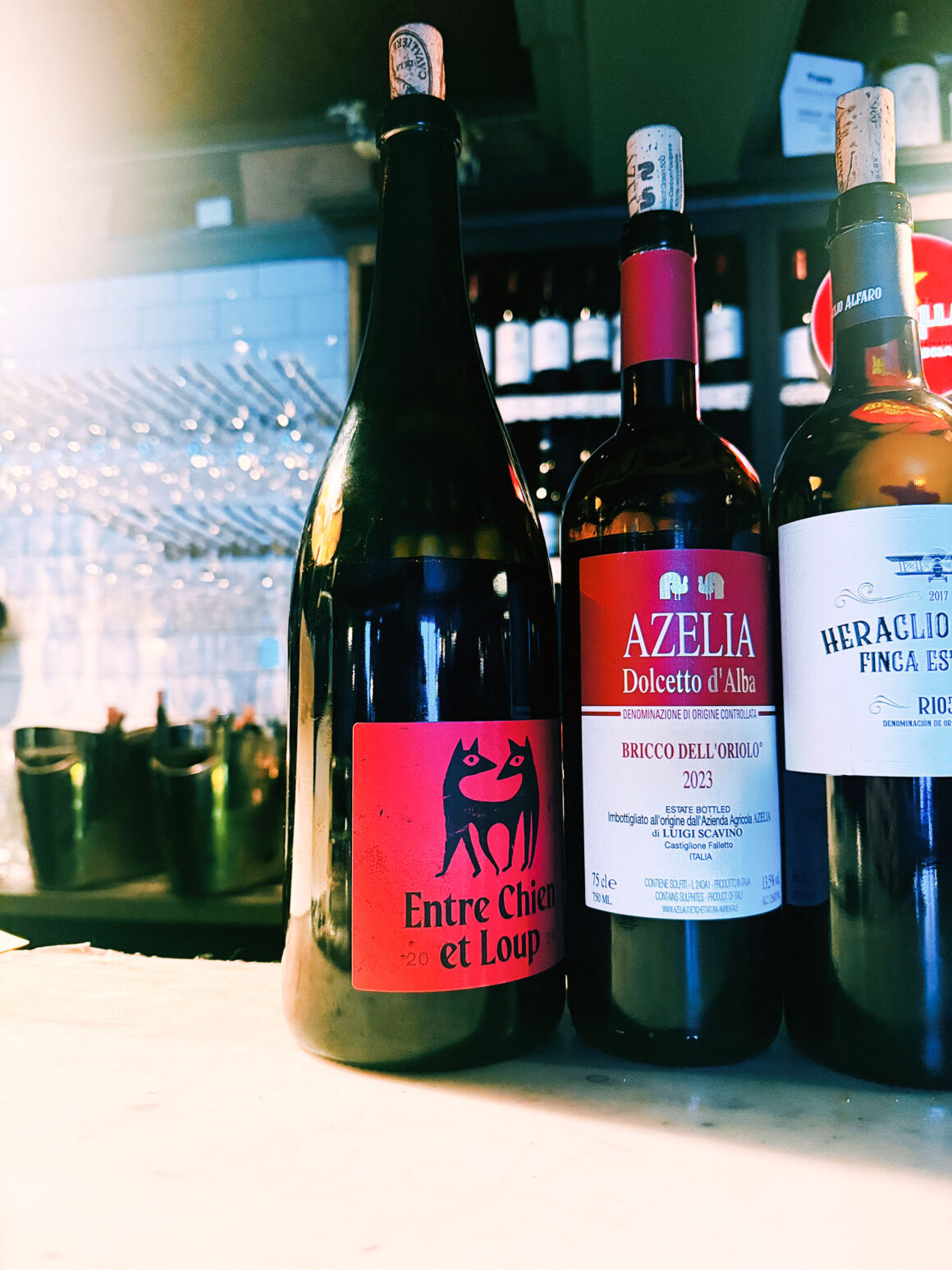 Vi började med ett glas Entre chien et loup (ljuvlig, tydlig association till hallon) och fortsatte med sicilianska Etna Rosso (lite spetsigare åt alla håll men trivdes fint i glaset). Beställde in chark och trivdes utomordentligt bra i två timmar. Perfekt AW-slot.