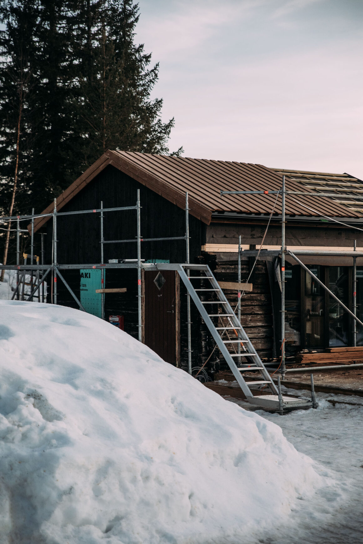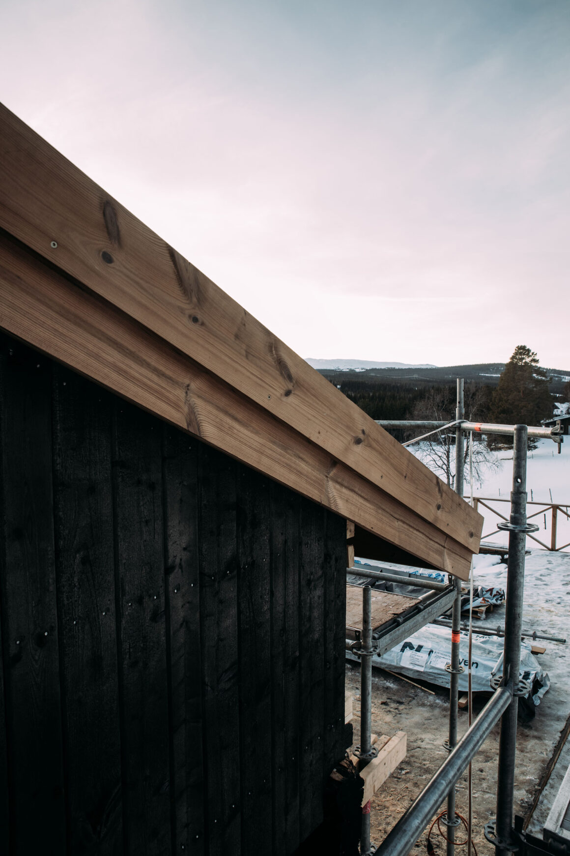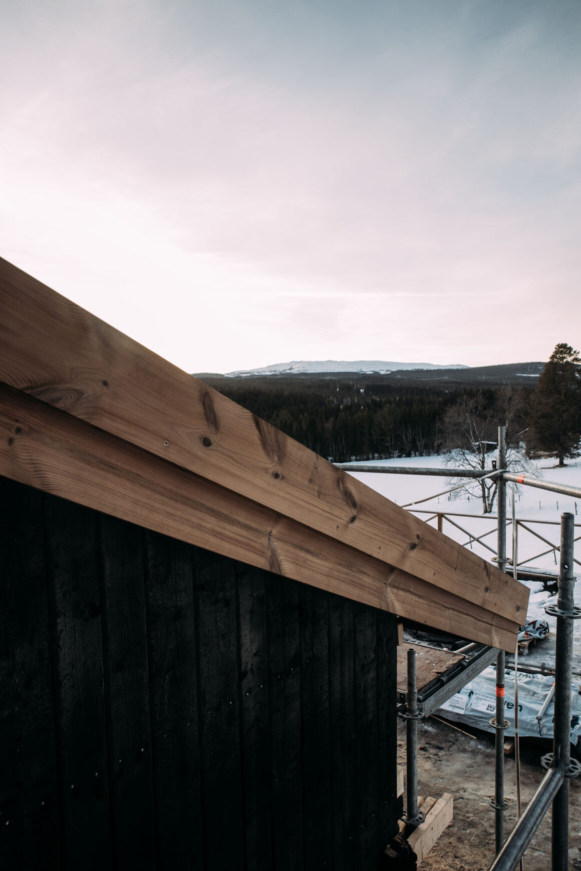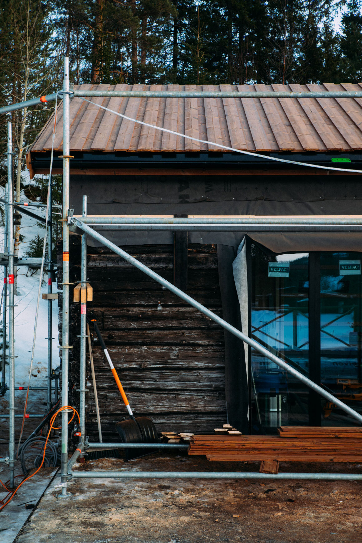 Hemma hos mig har det inte lagts klart ännu, och på de ställen där det lagts står byggnadsställningen stadig. Men snart står hela fjällstudion i sin prakt, med sina gamla timmerstockar, den sotbrända panelen och så faltaket. Med de nätta fönsterdörrarna och glasparti i nästan fyra meter bredd ut mot utsikten, fjällvärlden och friheten.